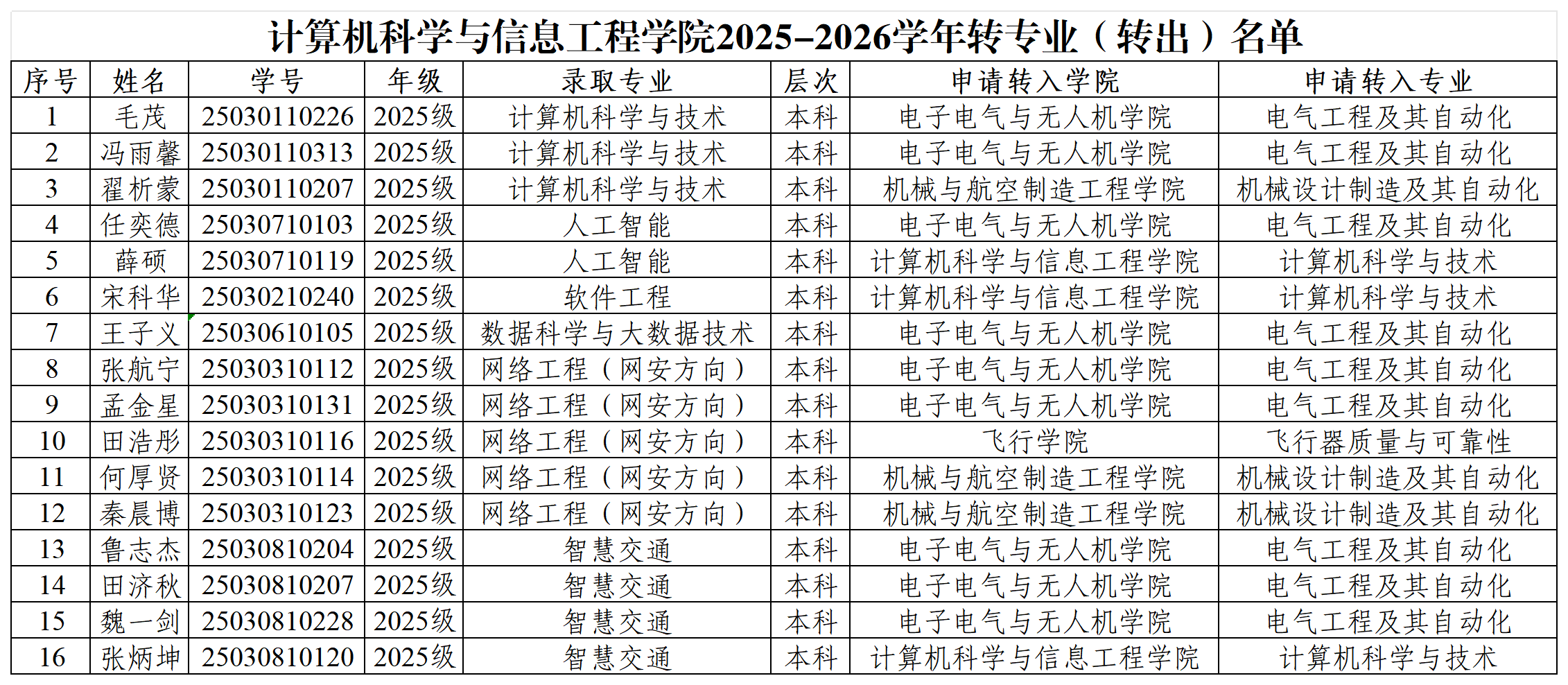 根据《安阳工学院学生转专业管理办法》,经个人申请,拟同意转出16人,现将拟转专业学生的信息公示如下。公示期从2025年12月26日至2025年12月30日,共计3个工作日。公示期内有异议的,可通过电话等形式进行反映。