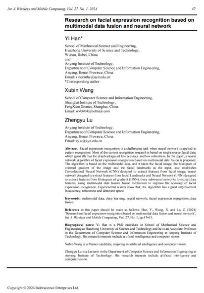 2024年7月十大买球韩毅老师在EI期刊International Journal of Wireless and Mobile Computing发表了题为《Research on facial expression recognition based on multimodal data fusion and neural network》文章,该研究针对目前多数识别面部表情研究是基于单源面部数据进行的,普遍存在准确率较低、鲁棒性不高的缺点。本研究提出了一种基于多源异构数据融合的神经网络面部表情识别算法,该算法以多源异构数据为基础,将面部图像、图像的方向梯度直方图以及面部特征点三项异构数据为输入,分别建立CNN,LNN,HNN三个子神经网络提取数据特征,采用异构数据特征融合机制,提了高面部表情识别的精度。实验表明,得益于异构数据间的互补性,该算法相对于传统人脸表情识别算法在精度、鲁棒性以及检测速度上都有较大的提升,特别是在人脸被部分遮挡、光照、头部姿势变换情况下,该算法也显示出较高置信度。