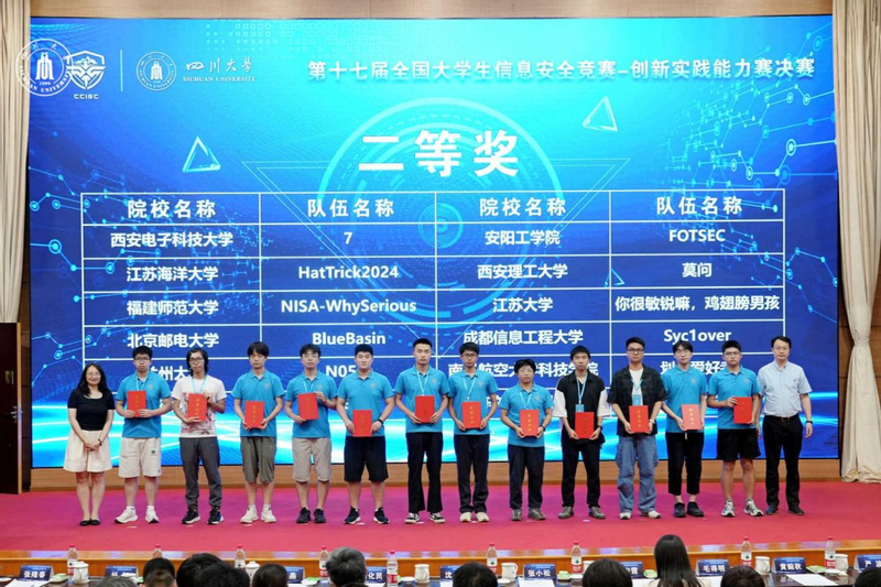 2024年7月20-21日,由教育部高等学校网络空间安全专业教学指导委员会主办的第十七届全国大学生信息安全竞赛——创新实践能力赛全国总决赛在四川成都成功举办。在校团委、教务处大力支持下,院信息安全团队组建的FOTCEC战队以华中赛区一等奖成绩挺进总决赛,经过激烈的攻防角逐,最终荣获全国二等奖。这是我校首次进入该赛事全国总决赛,创造了我校在全国大学生信息安全竞赛中的历史最好成绩!